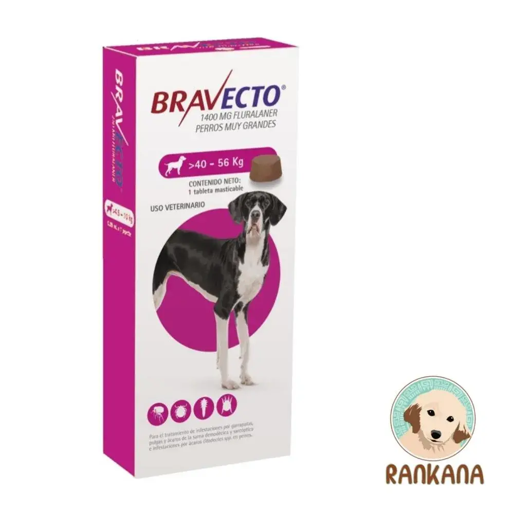 Bravecto de 40 a 56 kg se presenta en una caja con 1 comprimido masticable de 1400 mg. La administración debe realizarse siguiendo estrictamente la recomendación del médico veterinario, respetando el peso del perro y el intervalo indicado entre dosis.