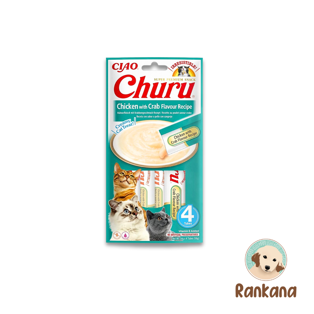 Churu pollo con cangrejo 4 sachets 14 g es un snack húmedo altamente palatable diseñado especialmente para gatos, combinando el sabor del pollo con la delicadeza del cangrejo en una presentación