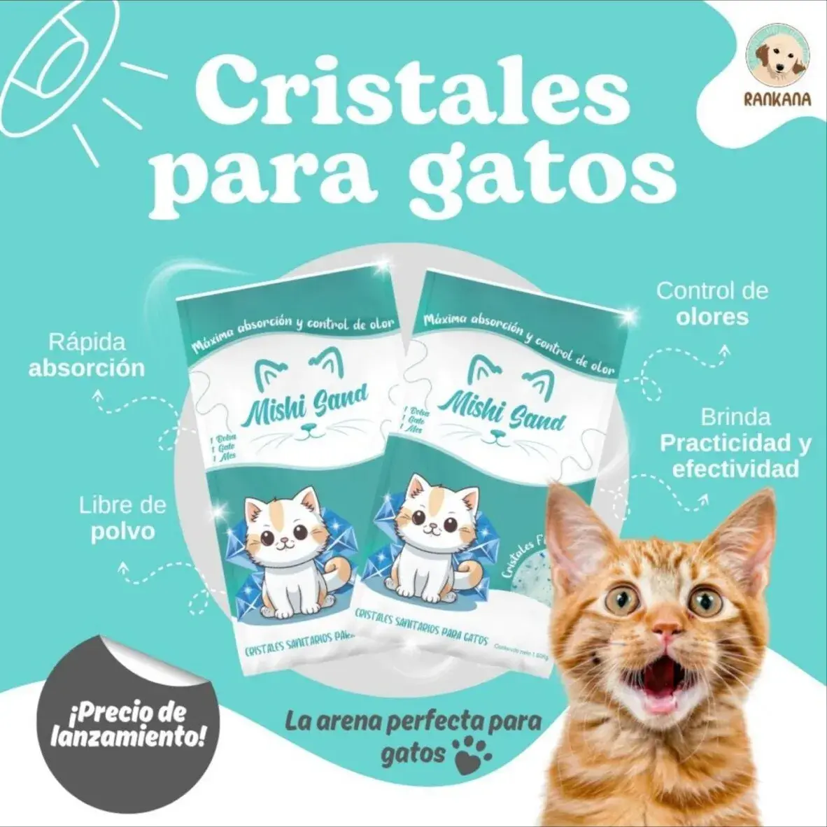 Empaque de 1.8 kg de Mishi Sand Cristales Finos, sustrato sanitario de sílice para un gato durante un mes, con ilustración de gatito kawaii y logo de Rankana.